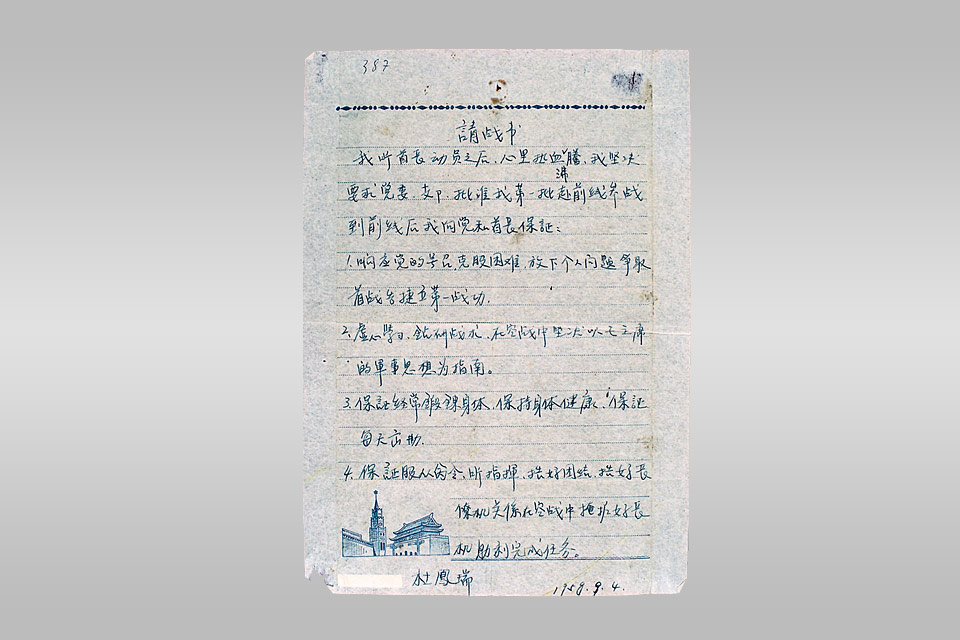 杜凤瑞(1933-1958),河南方城人,空军 某部飞行员。1948 年参加中国人民解放军,1956 年 10 月加入中国共产党。1958 年 9 月 4 日,杜 凤瑞写下此请战书,坚决要求赴福建前线参战。10 月 10 日,六架国民党空军 F-86 型飞机入侵龙田、 福州地区领空。杜凤瑞所在的空军某大队八架米 格 -17 型飞机与其展开空战。战斗中,杜凤瑞击 落敌机两架,所驾驶的飞机为掩护长机中弹负伤, 杜凤瑞跳伞时被敌机射中牺牲。