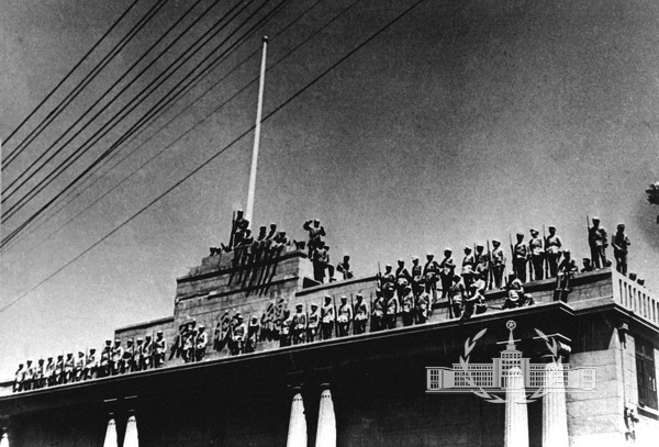 1949年4月23日,中国人民解放军一举解放了国民党统治中心一南京,宣告了历时22年的蒋家王朝的覆灭。照片记录了解放军占领国民党总统府的场面。几排威武的战士登上楼顶,把“总统府”踩在脚下,髙唱战歌,欢呼胜利,充分表达了毛泽东诗篇中的名句“天翻地覆慨而慷”的深刻内涵。据作者介绍,4月23日我军先头部队最早占领国民党总统府时,因无记者跟随拍照,遗漏了这一具有划时代意义的关键镜头。经电影摄影师申请后,于4月25日进行了补拍。这张照片是在25日,他和电影摄影师郝玉生一起补拍的。